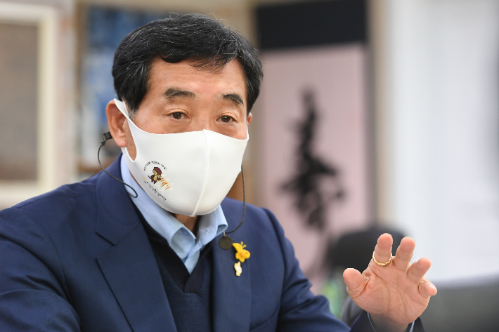 윤화섭 안산시장이 지난달 30일 시장실에서 진행한 CBS와의 인터뷰에서 시정 성과와 과제, 역점사업 등을 설명했다.(사진=안산시청 제공)