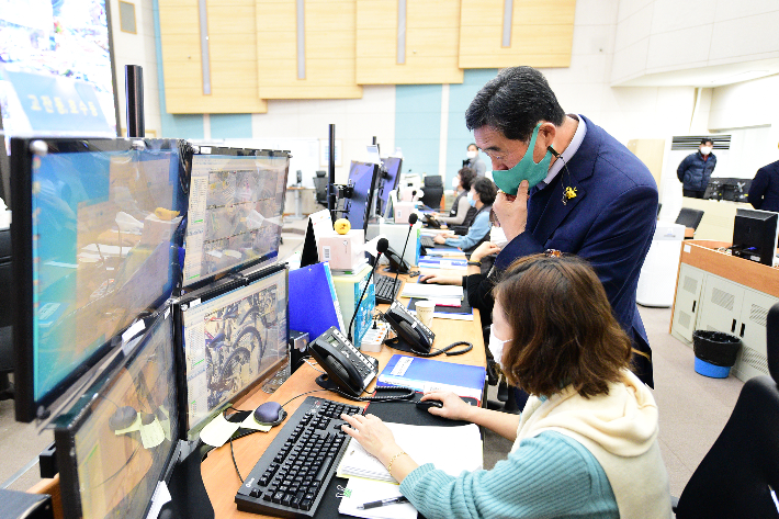 윤화섭 안산시장이 지난해 11월 25일 안산시 방범CCTV 통합관제센터를 방문해 현장 점검하고 있는 모습이다.(사진=안산시청 제공)
