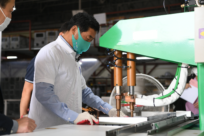 윤화섭 안산시장이 지난해 9월 21일 안산시 관내 기업을 방문해 코로나19 피해 현황과 작업 현장 여건 등을 점검했다.(사진=안산시청 제공)