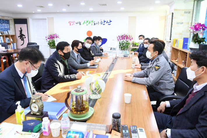 윤화섭 안산시장이 지난달 1일 안산시청에서 조두순 출소 관련 유관기관 간담회를 진행하고 있는 모습이다.(사진=안산시청 제공)