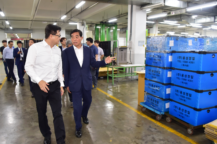 윤화섭 안산시장이 지난 2019년 7월 19일 안산시 관내 기업을 방문해 현장 점검을 하고 있는 모습이다.(사진=안산시청 제공)