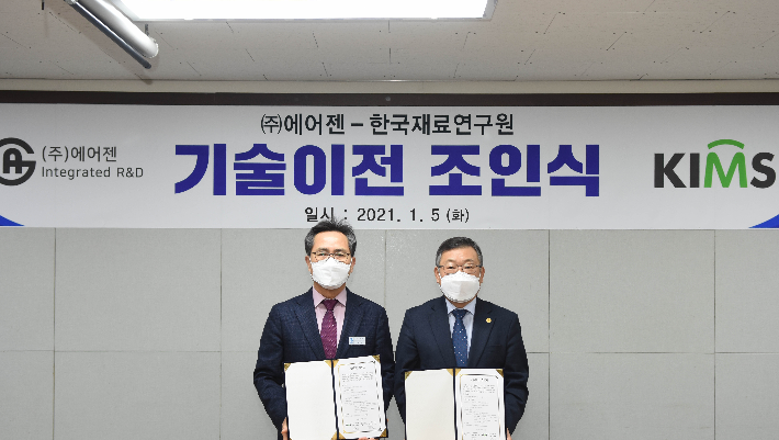 재료연구원은 5일 경남 김해에 위치한 삼정터빈에서 기술이전 조인식을 열고, 킴스 타이타늄 알루미나이드(KIMS TiAl #16) 신합금 기술을 ㈜에어젠(대표 배수호)에 이전했다.