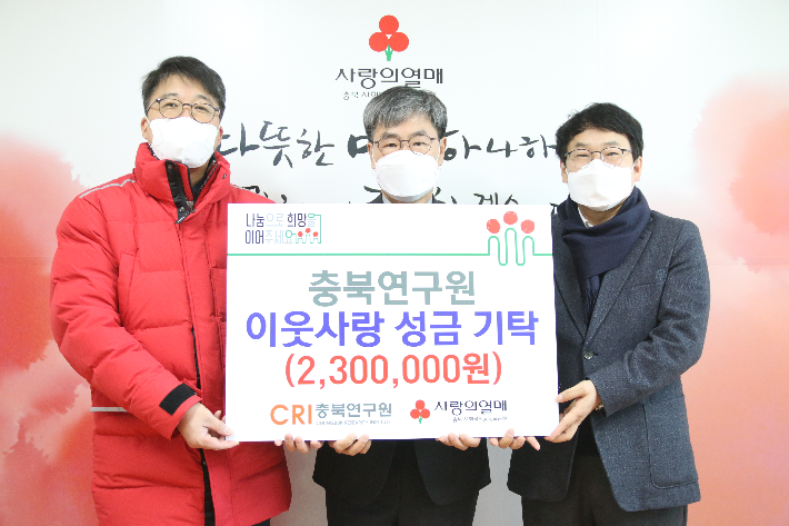 이번 성금은 충북연구원 직원들이 코로나19로 어려움을 겪고 있는 이웃을 위해 십시일반 모아 마련했다.