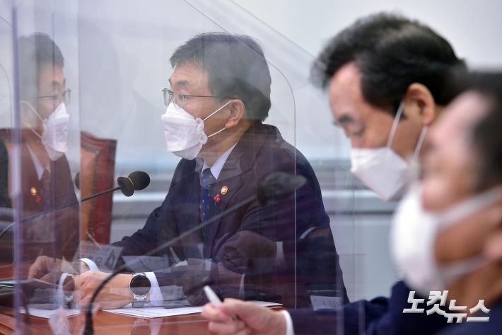 권덕철 보건복지부 장관이 14일 오전 국회에서 열린 더불어민주당 국난극복 K-뉴딜위원회 국난극복본부 점검회의에서 발언을 하고 있다.