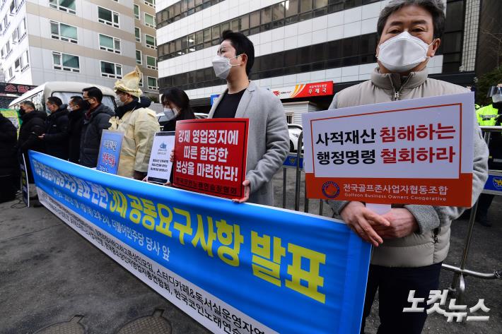 헬스장·필라테스·스터디카페·스크린골프·코인노래방 등 집합금지 업종 관계자들이 14일 오후 서울 여의도 더불어민주당사 앞에서 ‘16일 집합금지업종 조정 발표 관련 3대 요구사항 발표’ 기자회견을 갖고 있다.