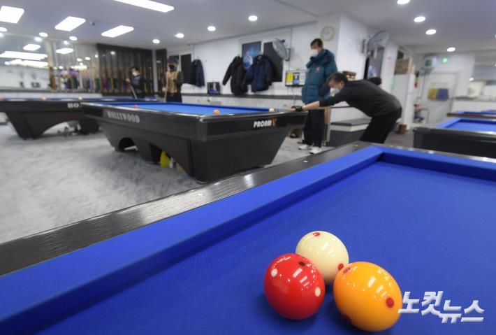 헬스장과 당구장, 노래방, 코인노래방 등 다중이용시설 이용이 재개된 18일 서울 관악구 한 당구장에서 시민들이 당구를 치고 있다.