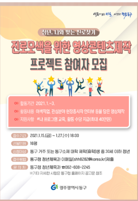광주 동구청은 진로를 고민하는 청년들이 자신에게 맞는 직업 등 진로를 찾을 수 있는 기회를 제공하기 위한 '청년, 나와 맞는 진로 찾기' 프로그램 참여자를 오는 27일까지 모집한다고 밝혔다.