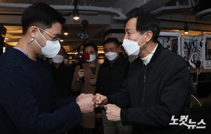 서울시장 보궐선거에 출마한 국민의힘 오세훈 전 서울시장이 21일 서울 서대문구 북가좌동에 위치한 한 PC방을 찾아, 코로나19로 극심한 피해를 본 자영업자들의 고충을 듣기 앞서 주먹인사를 하고 있다.