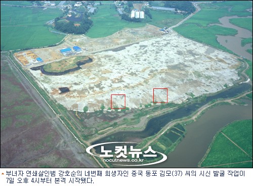 부녀자 연쇄살인범 강호순의 네번째 희생자인 중국 동포 김모(37) 씨의 시신 발굴 작업이 7일 오후 4시부터 본격 시작됐다.
