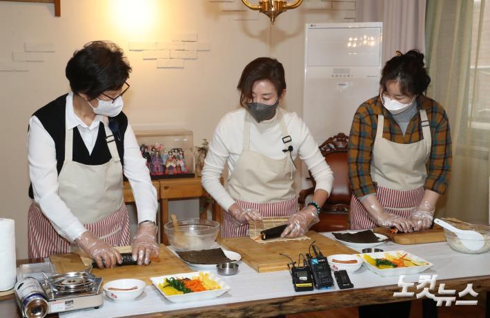 서울시장 보궐선거에 출마한 나경원 국민의힘 전 의원이 26일 오후 서울 마포구 연남동 '바투 스테이'에서 여성일자리 현장 체험프로그램에 참여해 김밥을 말고 있다.