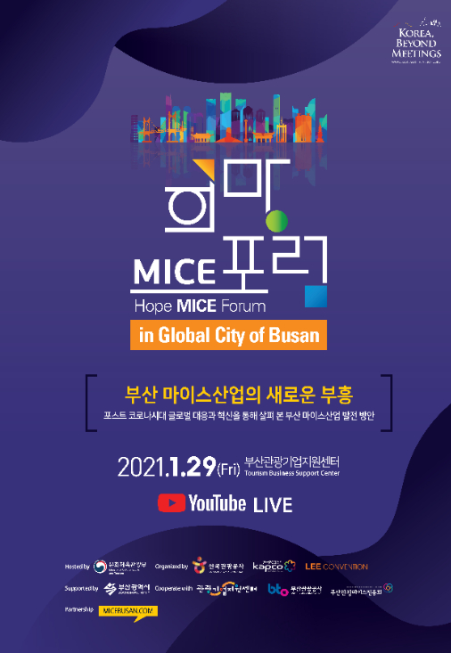 코로나19로 침체된 부산 MICE 업계의‘재부흥’활로를 찾고자 글로벌·국내 전문가를 초청, 기업의 발전 방안과 정책 방향을 모색하는 ‘부산 희망MICE 포럼’이 문화체육관광부 주최, 한국관광공사와 한국PCO협회 (주)리컨벤션 공동 주관으로 오는 29일 온라인 비대면 행사로 개최된다.