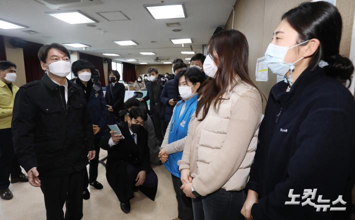 안철수 국민의당 대표가 27일 오전 서울 중구 남산생활치료센터를 방문해 보라매병원 파견 의료진들을 격려하고 있다.