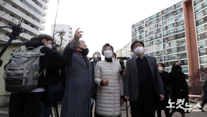 서울시장 보궐선거에 출마한 국민의힘 나경원 전 의원이 27일 오후 서울 강남구 대치동 은마아파트를 찾아 이정돈 은마아파트 주택재건축정비사업조합설립추진위원회 위원장(왼쪽 두번째)으로부터 설명을 듣고 있다.