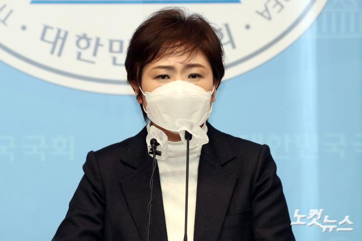 4·7 부산시장 보궐선거에 출사표를 던진 이언주 전 의원이 28일 오전 서울 여의도 국회 소통관에서 긴급 기자회견을 하던 중 울먹이고 있다.