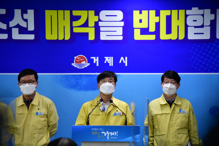 변광용 시장도 "대우조선해양은 국가 기간산업이자 25만 거제시민, 320만 경남도민의 먹거리 산업이기도 하다"며 "거제시는 구조조정과 조선 생태계 파괴로 지역경제 파국을 부를 대우조선 매각에 분명히 반대하며 일방적인 매각철회, 원점 재검토를 강력하게 촉구한다"고 밝혔다.
