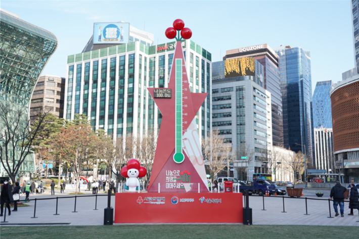 서울시청 광장에 세워진 '사랑의 온도탑'이 100도를 가리키고 있다. 사랑의열매 사회복지공동모금회 제공