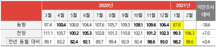 한국방송광고진흥공사가 2021년 2월의 광고 경기를 전망하는 광고경기전망지수(KAI ; Korea Advertising Index)를 발표했다. 2월 KAI는 106.3으로 전월 대비 강한 회복 조짐을 보이는 것으로 나타났다. 온라인·모바일 매체를 비롯하여 TV(지상파/케이블/종편), 라디오, 신문 등 모든 매체에서 강보합세를 나타냈다.