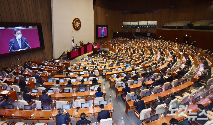 이낙연 더불어민주당 대표가 2일 오전 국회 본회의장에서 열린 제384회 국회(임시회) 제2차 본회의에서 교섭단체 대표연설을 하고 있다. 윤창원 기자