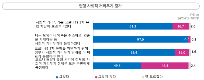 여기에 3차 유행 시기 거리두기 정책이 모든 국민에게 공정했는지를 묻는 질문에는 48.3%가 그렇지 않다고 답했다. 공정했다고 생각한 국민은 49.3%였고, 잘 모르겠다는 2.4%였다.