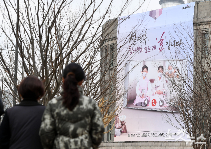 정부가 사회적 거리두기를 설 연휴까지 2주간 연장한 가운데 지난 1일 서울 중구 서울도서관에 코로나19 확산 방지를 위한 ‘설연휴, 찾아뵙지 않는게 '효'입니다' 라는 문구가 적힌 대형 현수막이 걸려 있다. 황진환 기자