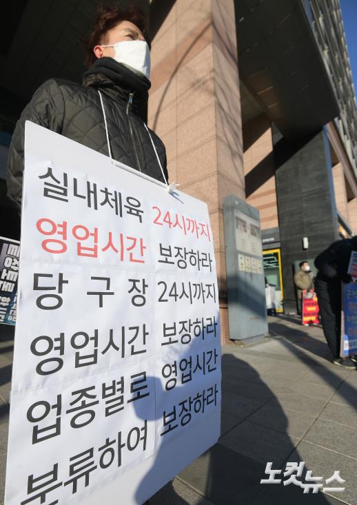 '거리두기 단계 개편을 위한 공개토론회'가 열린 2일 서울 중구 LW컨벤션 앞에서 자영업자들이 1인 시위를 나서며 영업시간 연장 등을 촉구하고 있다.