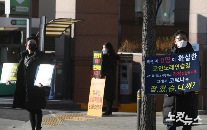 '거리두기 단계 개편을 위한 공개토론회'가 열린 2일 서울 중구 LW컨벤션 앞에서 자영업자들이 1인 시위를 나서며 영업시간 연장 등을 촉구하고 있다.