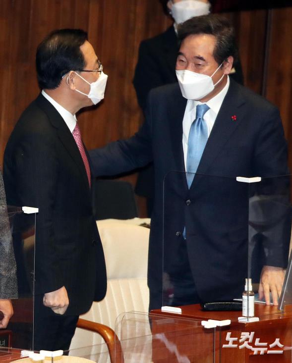 이낙연 더불어민주당 대표가 2일 오전 국회에서 열린 제384회 국회(임시회) 제2차 본회의 교섭단체대표연설에 앞서 주호영 국민의힘 원내대표와 대화를 하고 있다.