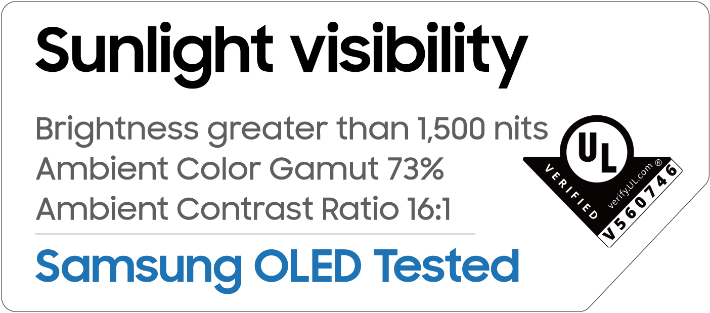 UL은 평가를 위해 디스플레이의 야외 시인성에 영향을 주는 색영역과 휘도 등을 측정했다. 그 결과 삼성 OLED는 '밝은 환경에서의 색영역(Ambient Color Gamut · 밝은 환경에서 측정한 색영역을 의미하며 같은 사양의 디스플레이라 할지라도 주변 밝기에 따라 사람 눈에 보이는 색영역이 달라진다))'이 DCI-P3 기준 73%를 충족했으며 최고 휘도는 1500nit(니트) 이상으로 나타났다.