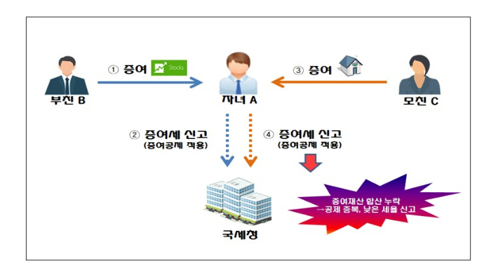 국세청은 주택 증여 관련 변칙적 탈루혐의자 1822명을 선정하고 정밀 세무검증을 실시한다. (아파트 증여 신고 시 과거 주식 증여재산 합산 신고 누락 선정사례). 국세청 제공