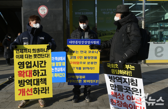 '거리두기 단계 개편을 위한 공개토론회'가 열린 2일 서울 중구 LW컨벤션 앞에서 자영업자들이 1인 시위를 나서며 영업시간 연장 등을 촉구하고 있다. 이한형 기자