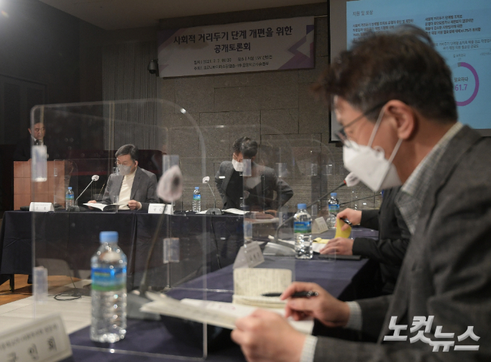 2일 서울 중구 LW컨벤션에서 '거리두기 단계 개편을 위한 공개토론회'가 진행되고 있다. 이한형 기자