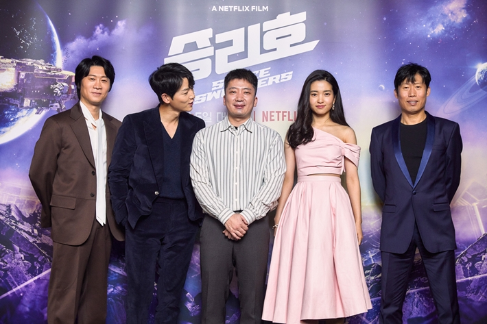 2일 오전에 열린 영화 '승리호' 프레스 컨퍼런스에 참석한 감독과 배우들. 사진 왼쪽부터 순서대로 배우 진선규, 송중기, 조성희 감독, 김태리, 유해진. 넷플릭스 제공