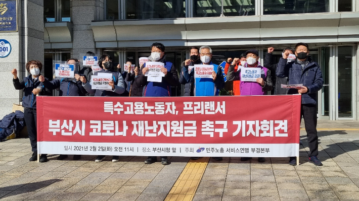 민주노총 서비스연맹 부산경남본부는 2일 오전 11시 부산시청 앞에서 기자회견을 열고, "부산시는 재난지원금 지급 대상에서 제외된 특수고용노동자와 프리랜서에게 지원금을 지급해야 한다"고 주장했다.