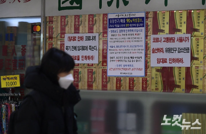 서울 중구 명동 지하상가에 임대료 인하를 요구하는 호소문이 붙어 있다. 이한형 기자
