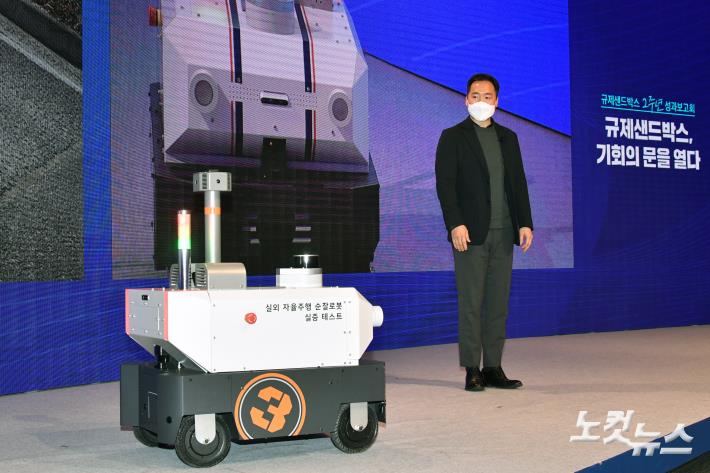 김진효 도구공간 대표가 2일 오후 서울 중구 대한상의에서 열린 규제샌드박스 2주년 성과보고회에서 참석해 규제샌드박스 실증특례를 부여받은 실외자율주행 순찰로봇 '패트로버'를 소개하고 있다.