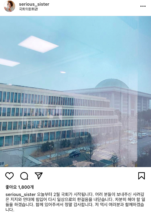 장 의원은 2일 국회 의원회관 사무실 창문에서 본청과 소통관을 겹쳐 찍은 사진을 인스타그램에 공유하며 "오늘부터 2월 국회가 시작된다"고 밝혔다.