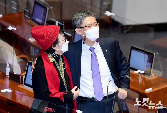 조정훈(오른쪽) 시대전환 대표와 김진애 열린민주당 원내대표가 3일 서울 여의도 국회에서 열린 본회의에 앞서 대화하고 있다.