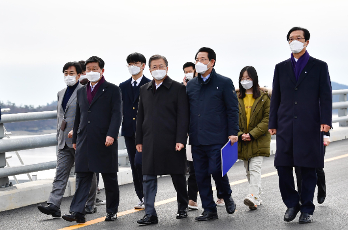 문재인 대통령이 5일 오후 전남 신안군 임자2대교에서 열린 '세계 최대 해상풍력단지 48조 투자협약식'을 마친 뒤 다리를 시찰하며 참석자들과 대화하고 있다. 전라남도 제공