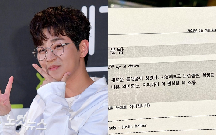 왼쪽부터 딘딘, 딘딘이 '클럽하우스'에 관해 남긴 짧은 평. 박종민 기자/딘딘의 뮤직하이 인스타그램