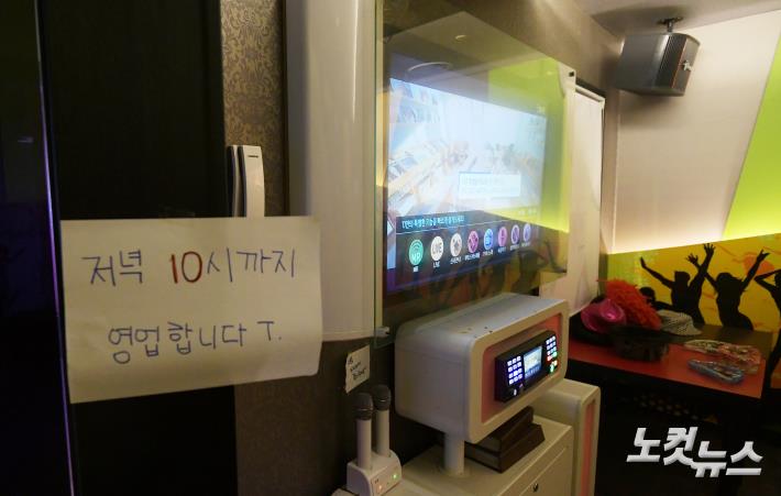 16일 서울의 한 코인노래방에 밤 10시까지 영업을 한다는 안내문이 붙어 있다.