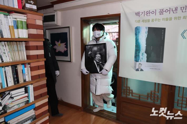 고 백기완 선생 영결식이 열린 19일 오전 서울 중구 대학로 통일문제연구소에서 노제를 지내며 영정이 연구소를 돌아보고 있다.