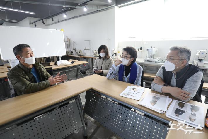 봉제디자인이음협동조합 방문해 대화하는 최강욱-김진애