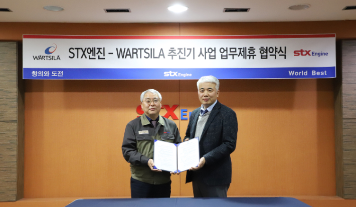 STX엔진 특수본부 이상수 본부장(왼쪽), WARTSILA KOREA 오세정 대표. STX엔진 제공
