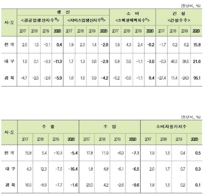 동북지방통계청이 22일 발표한 '2020년 연간 대구·경북지역 경제 동향'자료를 보면 광공업생산의 경우 대구는 기계·장비, 자동차, 트레일러 등이 줄어 전년 대비 11.3%가, 경북은 전자부품·컴퓨터·영상·음향·통신·장비, 전기장비 등이 부진해 전년 대비 5.9%가 각각 감소했다.