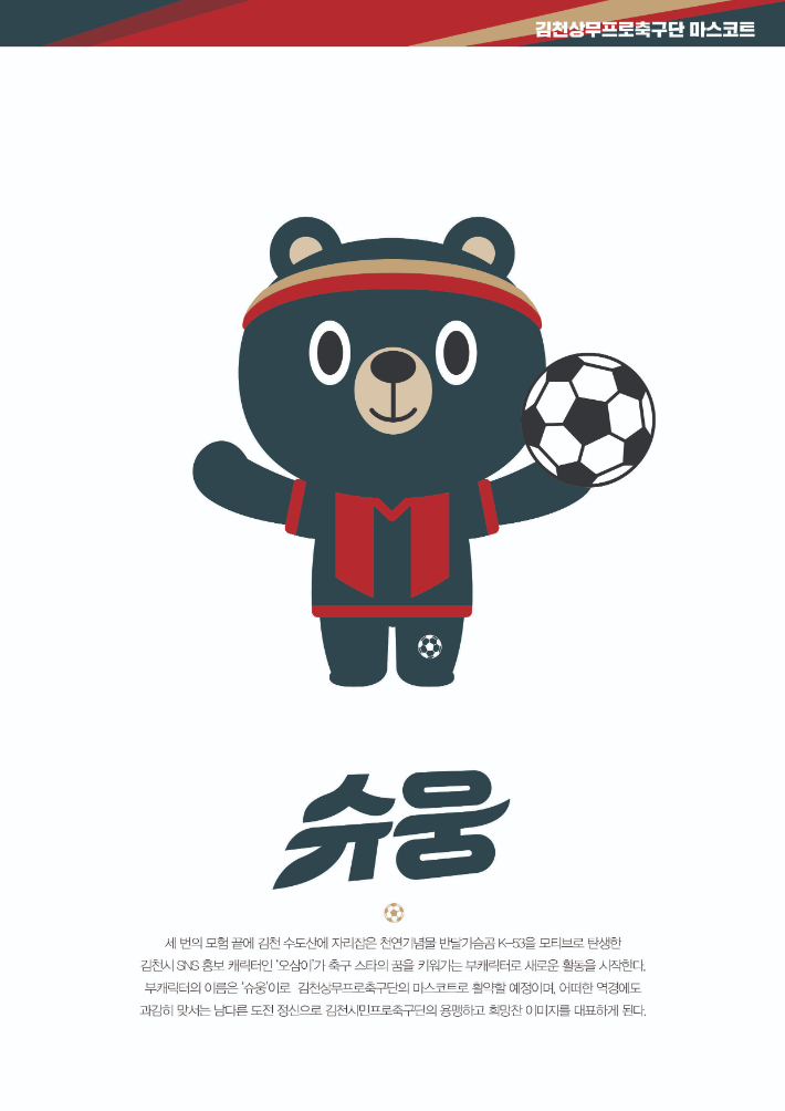 김천상무는 이날 출범식에서 연고지 김천시의 SNS 홍보 캐틱터 ‘오삼이’의 부 캐릭터 ‘슈웅’을 마스코트로 공개했다. 어떠한 역경에도 과감히 맞서는 남다른 도전 정신으로 김천상무의 용맹하고 희망찬 이미지를 대표한다는 설명이다.