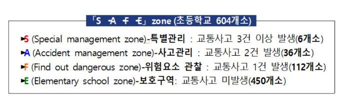 경찰은 어린이보호구역의 체계적 관리에도 들어가기로 했다. 보호구역 내 어린이 교통사고 분석을 통해 사고 발생률이 높은 초등학교를 교통사고 발생 건수에 따라 위험도를 이른바 S·A·F·E zone으로 분류하기로 했다. 사고유형에 따른 보호구역 교통사고 위험요소를 정밀진단하고 위험도가 높은 장소부터 우선적으로 시설물을 개선할 예정이다.