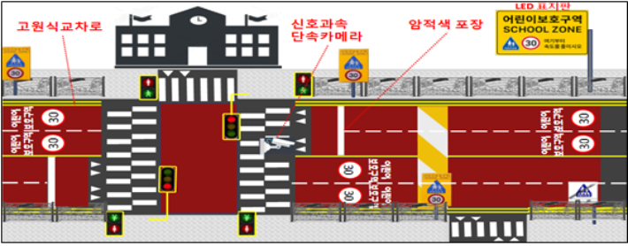 해당 모델은 보호구역 전 구간을 미끄럼방지 암적색으로 포장하고 노란신호등 및 LED 표지판을 설치하는 것을 말한다. 이 포장을 하면 운전자가 해당 구간이 어린이보호구역임을 곧바로 인식할 수 있고, 도로의 마찰력도 커지게 돼 미끄러짐 사고를 줄일 수 있다.