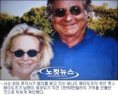 금융감독 당국에 따르면 루스 메이도프는 지난해 11월 25일 550만달러, 그리고 남편이 체포되기 전날인 12월 10일 1천만달러를 각각 인출했다는 것.