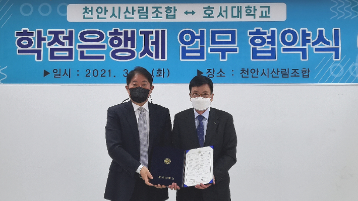 호서대학교(총장 김대현) 평생교육원과 천안산림조합이 '학점은행제 업무협약'을 체결했다. 호서대 제공