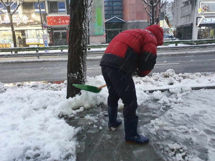 지난 1일 한 주민이 눈·비를 맞으며 쌓인 눈을 치우고 있다. 유선희 기자